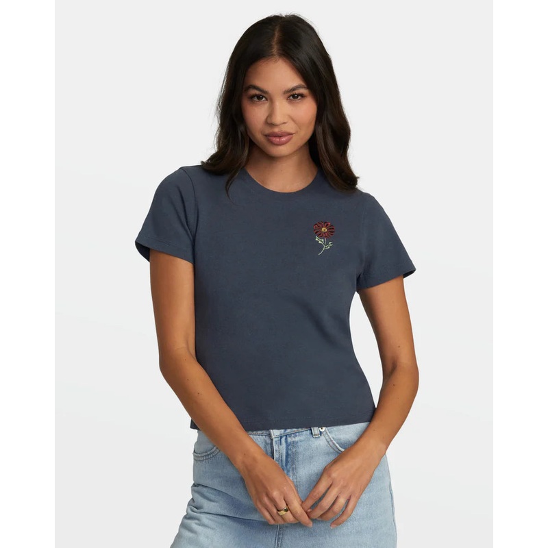 The RVCA Flower short-sleeved tee channels a laid-back vibe with its loose-knit cotton jersey fabric and embroidered floral graphic on the chest.