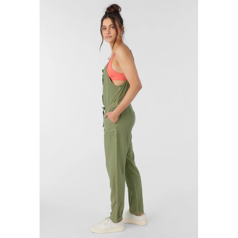 Laid-back woven jumper that features a front button design, over the shoulder straps and a straight leg fit.
