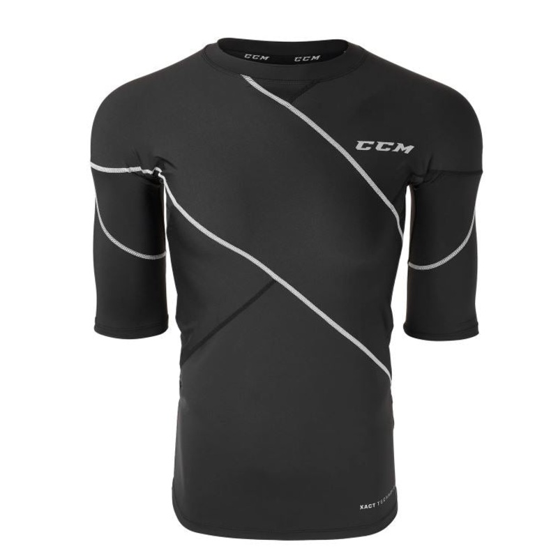 The CCM XACT Short Sleeve Compression Shirt utilizes key design elements to give players incredible muscle and joint support. Individuals can choose between a right or left dominant “X” panel which extends protection across the shoulder for enhanced stabilization.
