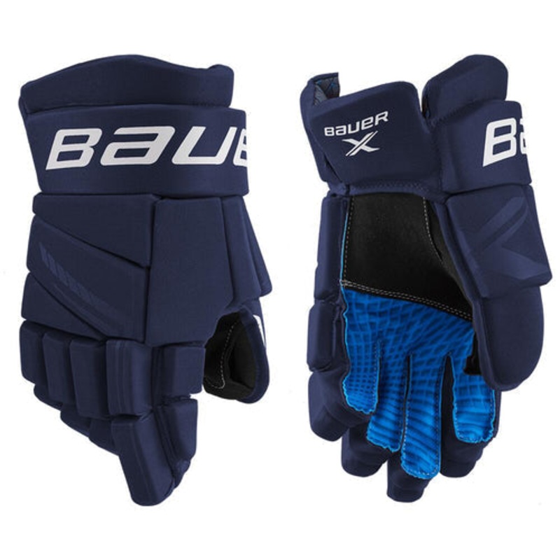 The Bauer X Hockey Glove is a recreational level glove that features MD foam with PE inserts in the backhand and fingers with a 2-piece flex thumb. Key upgrades include a TAKTILE palm and sublimated liner.