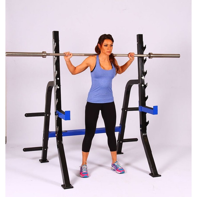 The Xplode 225 Squat Rack is a commercial grade rack, designed for heavy usage. The 8 different gun positions provides safe use without the need for a spotter and gives the user the ability to walk the bar up and down without removing plate weights. The 4 storage posts allow for quick and easy access to your weight plates while keeping your workout area organized.