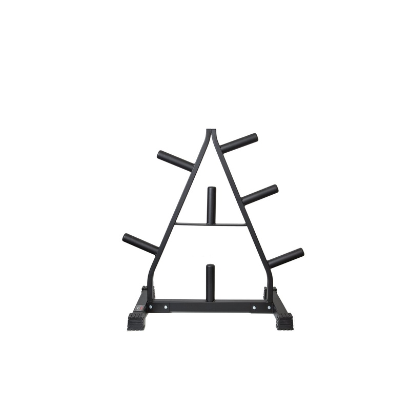 This Olympic A Frame Plate Tree keeps 2 Olympic weights up off the floor, preventing tripping hazards and allowing for easy plate changes. It features five external plate storage pegs as well as two storage pegs in the center for smaller plates. The A-frame design helps to distribute the weight and the wide base pieces keep the stand from tipping. The attractive black finish compliments most workout spaces.