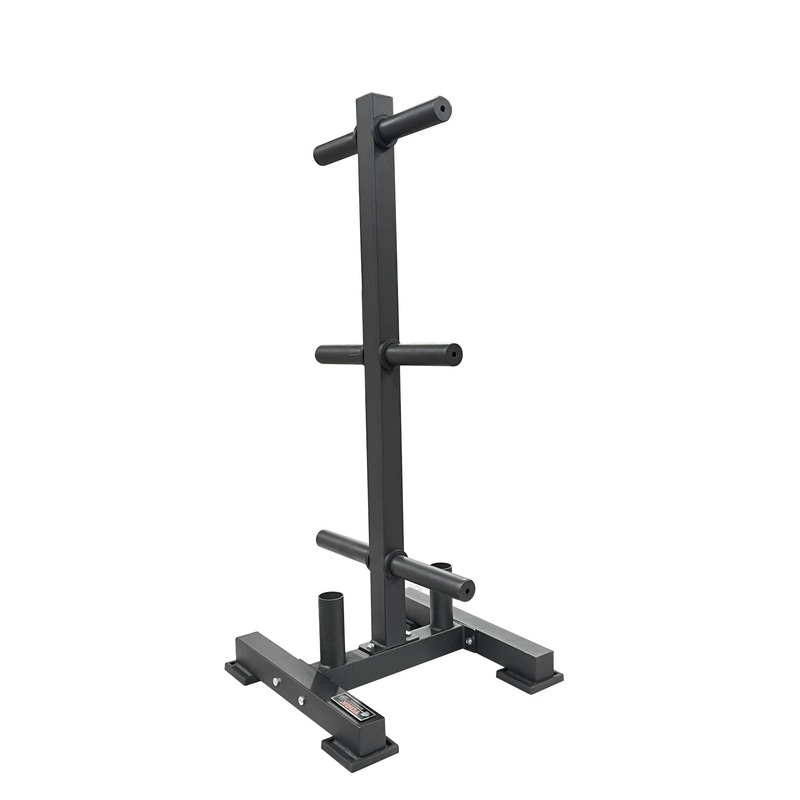 This Bumper Weight Plate Tree keeps your bumper plates up off the floor, preventing tripping hazards and allowing for easy plate changes. It features six plate storage pegs that can accommodate all bumper plate sizes. This rack also features two Olympic barbell holders for storage. The design of this plate tree helps to distribute the weight evenly as well as keep the rack from tipping over when loaded. The attractive black finish compliments most workout spaces.