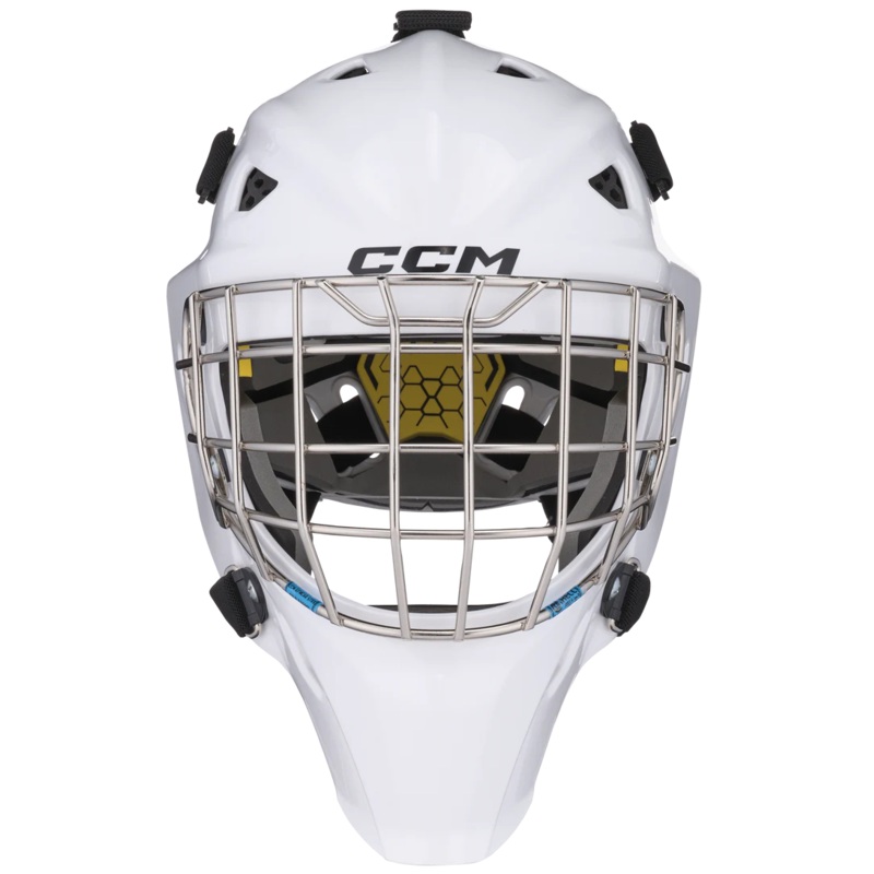 Shaped for puck deflection in key impact zones. Strategic vent hole shape and placement for improved airflow.