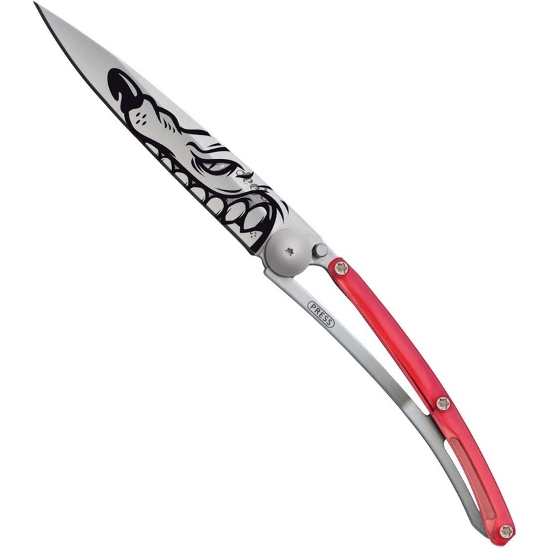Deejo Tattoo 37g Red Winter Zakmes. Ultra-licht. Veilig sluitsysteem en gedecoreerd met prachtige laser gravering. Compleet met riem clip.